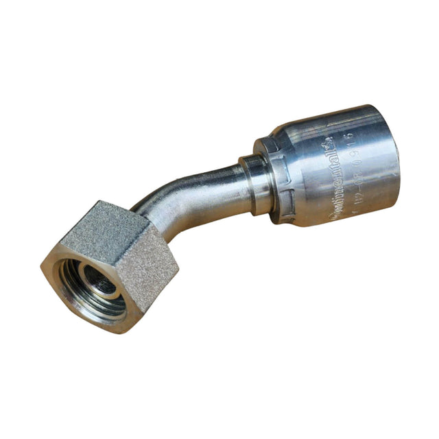One-Piece Crimp Fitting: DIN Metric Heavy Female Swivel 45° Elbow