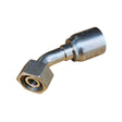 The B2-DLFX45 DIN Metric Light Female Swivel 45° One-Piece Crimp Fitting is designed for hydraulic hose assemblies where compact, angled routing is required. The 45° elbow allows hoses to exit fittings cleanly around equipment frames or into restricted spaces while maintaining reliable 24° cone sealing performance.