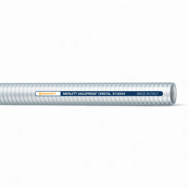 Continental Vacupress Cristal is a premium-quality suction and pressure hose designed for hygienic transfer of food-grade liquids. It’s ideal for beverage bottling plants, food processing, brewery operations, and liquid transfer lines. Reinforced with high-tensile textile layers and a steel helix, this hose handles both suction and discharge with exceptional flexibility and strength—even for fluids containing up to 20% alcohol content.