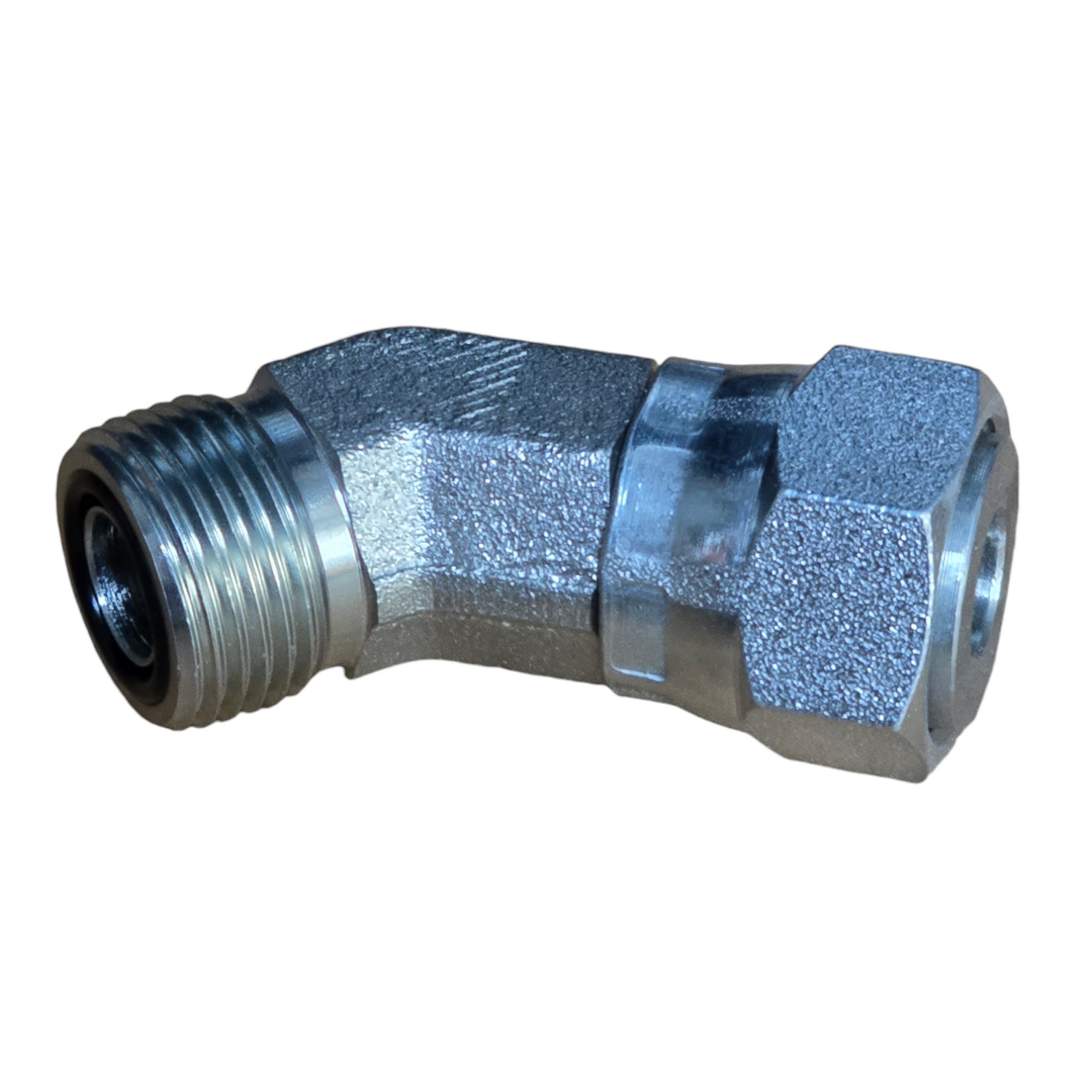 OFM-OFFX45 – ORFS Male x ORFS Female Swivel 45° Elbow adaptor connects ORFS (O-Ring Face Seal) fittings at a 45-degree angle, providing a smooth, leak-free directional change within hydraulic and fluid-transfer systems. The swivel female end allows 360° rotation for easy hose alignment, reducing twist and stress during installation or operation.