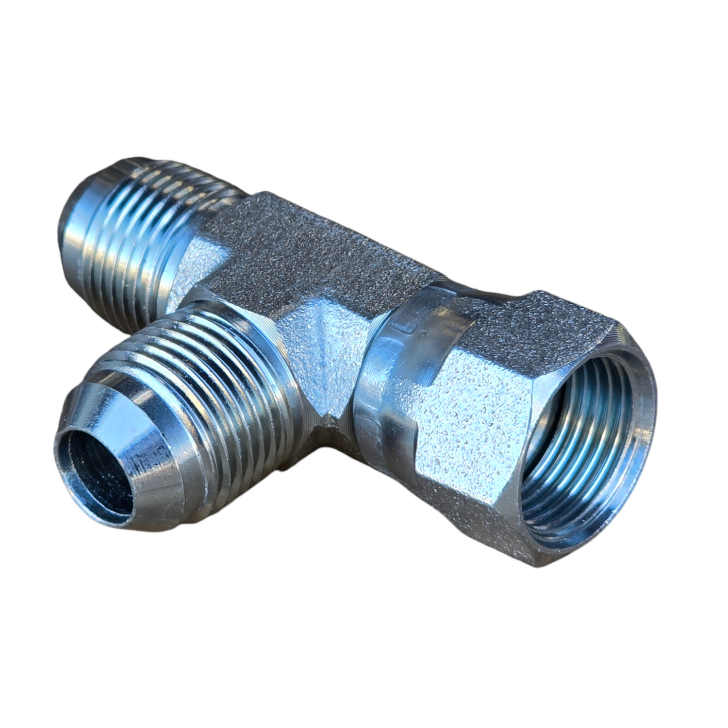 JCM-JCFX-JCM – JIC Male x JIC Female Swivel Run Tee adaptor connects two JIC (Joint Industry Council) 37° flare male fittings with a JIC female swivel branch outlet. This configuration allows for a strong, leak-free junction while providing a branch connection in hydraulic and fluid-transfer systems. The swivel female outlet enables easy alignment and assembly without twisting the hose.