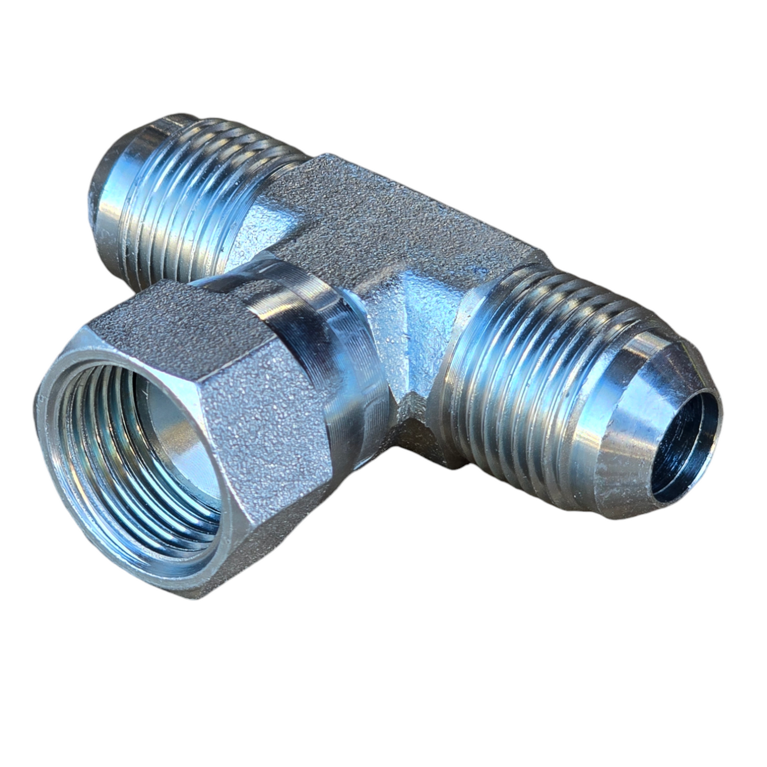 JCM-JCM-JCFX – JIC Male x JIC Female Swivel Branch Tee adaptor connects two JIC (Joint Industry Council) 37° flare male fittings with a JIC female swivel branch outlet. This compact tee configuration provides a strong, leak-free junction and allows easy alignment of the branch line via the 360° swivel female port, ensuring versatility in complex hydraulic assemblies.